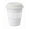 Einwandiger Becher aus glänzend weißem PP mit Silikon-Deckel und -Griff. Füllmenge: 350 ml. Da der einwandige Becher die Hitze nach außen leiten kann, kann der Artikel heiß werden.